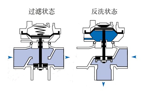 反沖洗閥應(yīng)用于至少有兩個(gè)并列過(guò)濾單元的自動(dòng)反沖洗過(guò)濾系統(tǒng),即:在反沖洗過(guò)程中,經(jīng)一個(gè)過(guò)濾單元過(guò)濾后的潔凈水作為另外一個(gè)過(guò)濾單元的沖洗水。