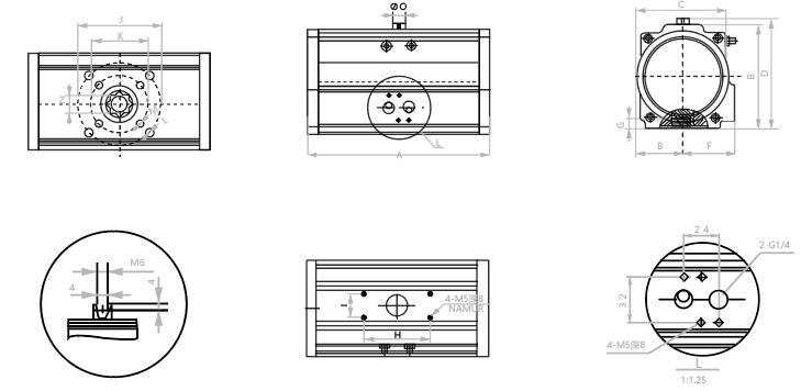 6、外部結(jié)構(gòu)一樣的執(zhí)行器有雙作用工和單作用式(彈簧復(fù)位)供選擇.便于安裝輸出的所有附件。