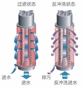 過濾系統(tǒng)有兩種運行狀態(tài):過濾狀態(tài)和反沖洗狀態(tài)。