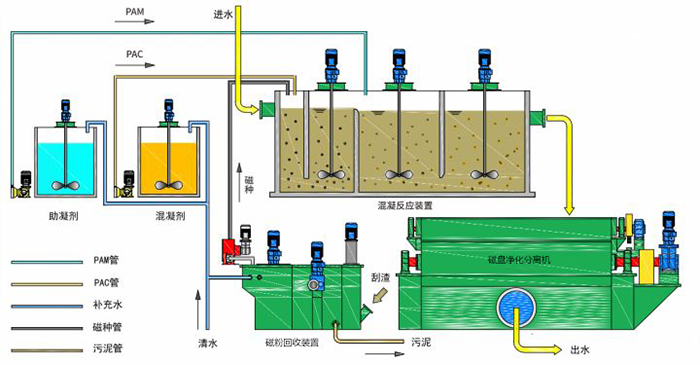 磁分離凈化水處理系統(tǒng)工藝技術(shù)具有穩(wěn)定成熟、分離時間短、處理能力大等特點。